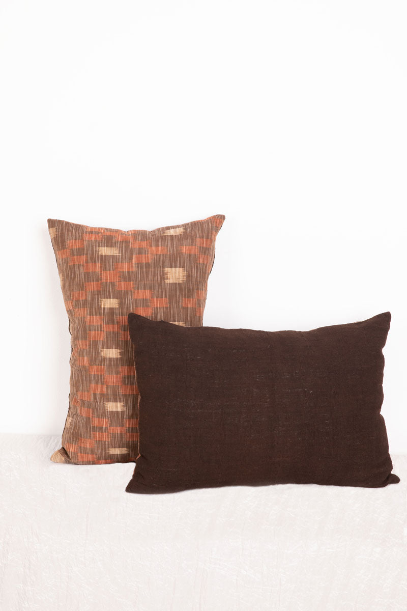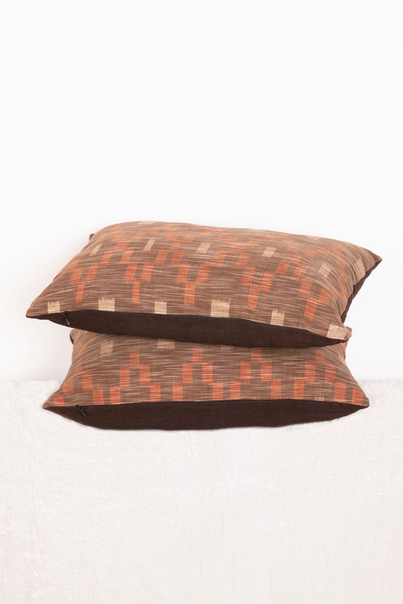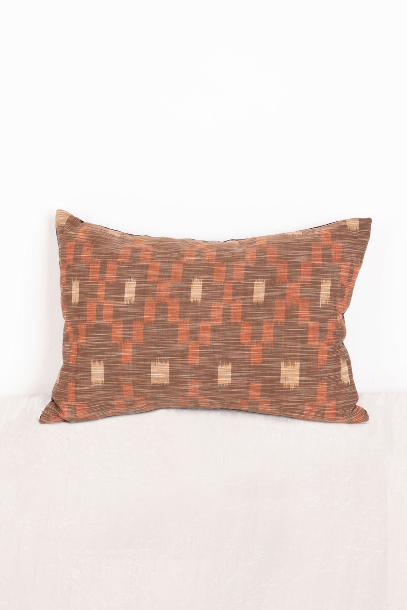 The natural dyed weft ikat pattern on this pillow is made by weavers in Seraya. The back panel is a hearty handspun cotton woven on a backstop loom and dyed to a deep rust using sustainably harvested Ceriops tagal bark from Papua and then layering with mud dye.