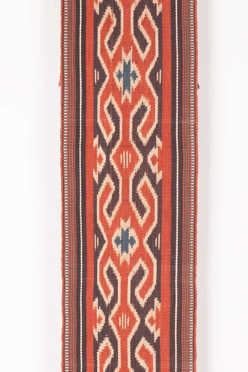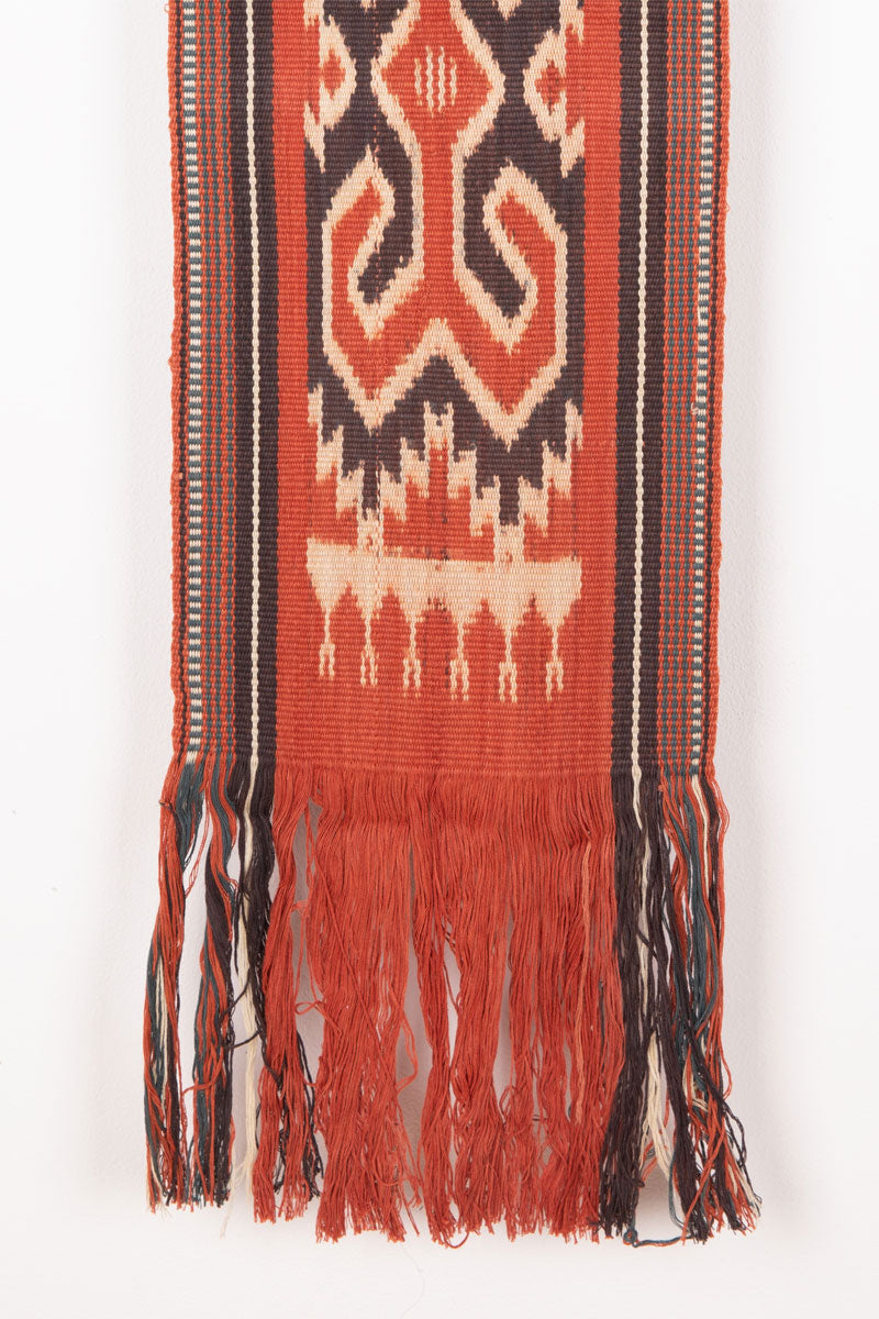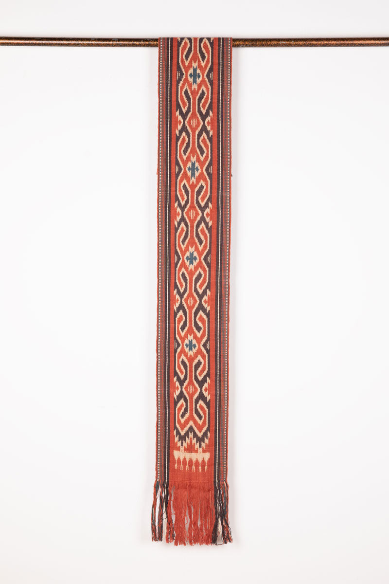 Selendang or shoulder scarf is a single panel textile that is made with ikat motifs using the red, blues and blacks of a sekomandi made by weavers in central Sulawesi who call themselves To Mangki Karataun. The motif tosso balekoan which represents a niddy-noddy that is used for making skeins of yarn after being spun from cotton. A textile like this is tied, dyed and woven by a single woman and the sale of the textile represents significant income in this remote area of Sulawesi.