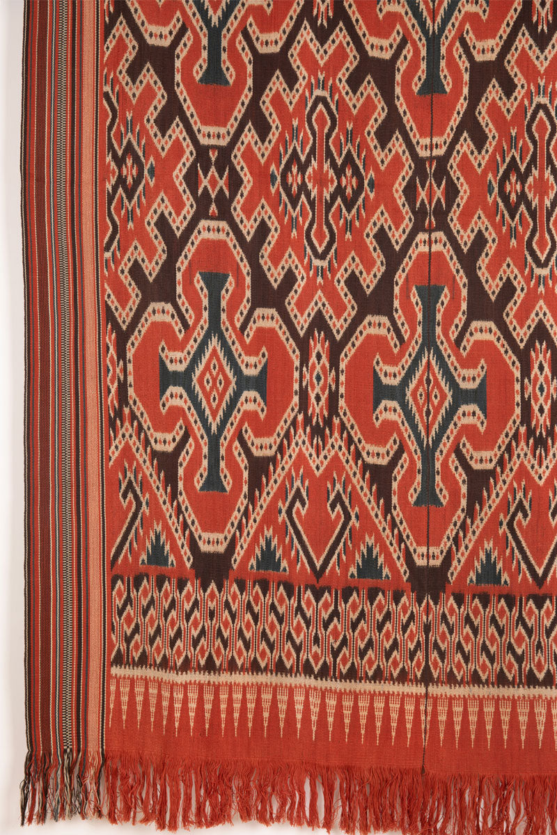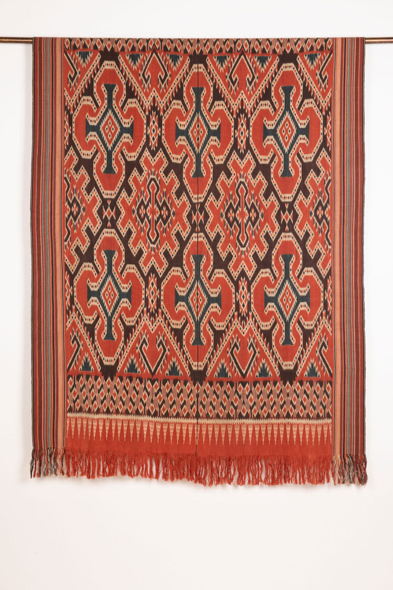 Warp ikat, two panels stitched together, open fringes, commercial cotton, natural dyes. Ikat tied, dyed and woven in Mamuju, Sulawesi, 2025. Size 202 x 129 cm / 79.5 x 51 in
