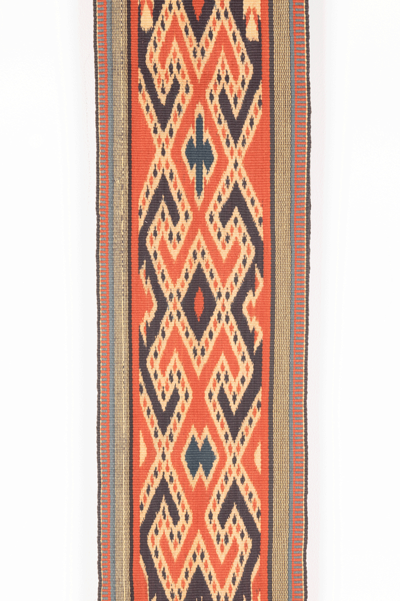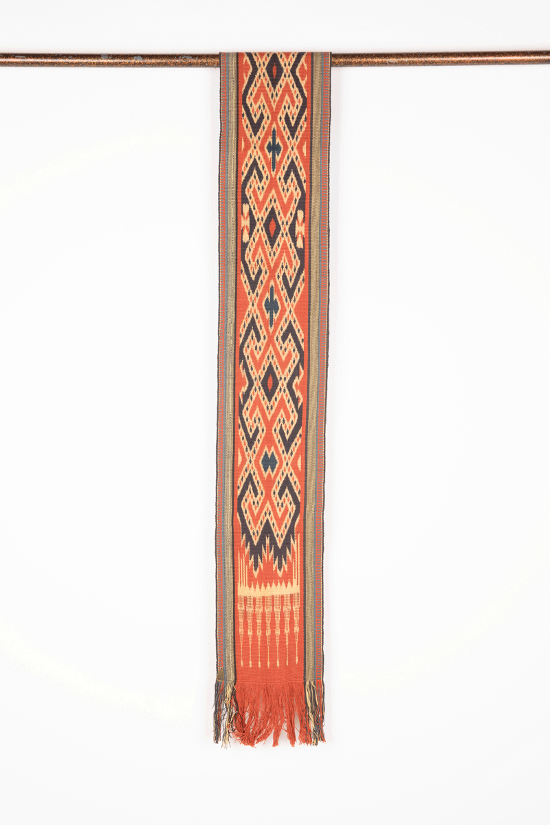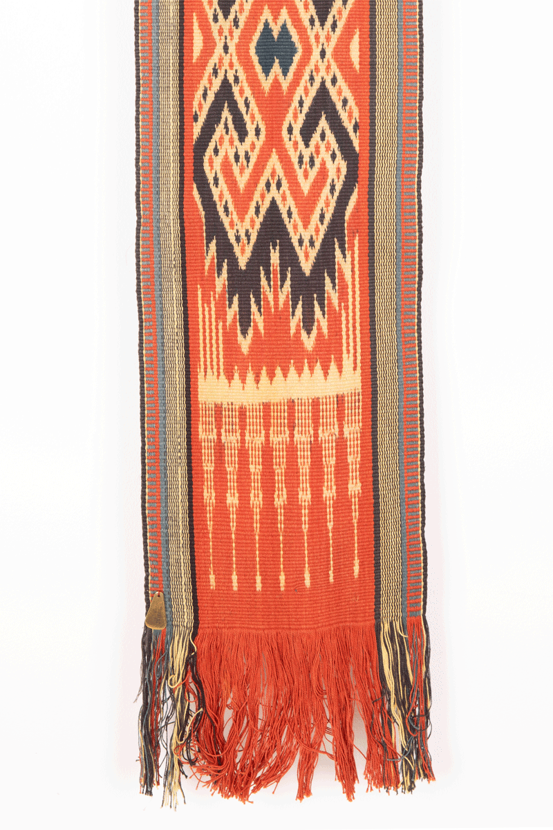 Selendang or shoulder scarf is a single panel textile that is made with ikat motifs using the red, blues and blacks of a sekomandi made by weavers in central Sulawesi who call themselves To Mangki Karataun. The tonoling is the name of a compound near Rongkong to the north of the Karataun weaver group. This motif refers to the relationship through marriage between the two areas. This motif is a reminder of the importance of relationships.