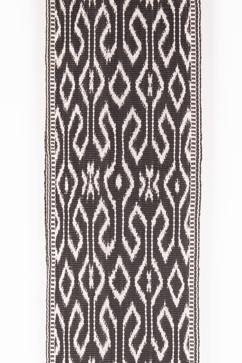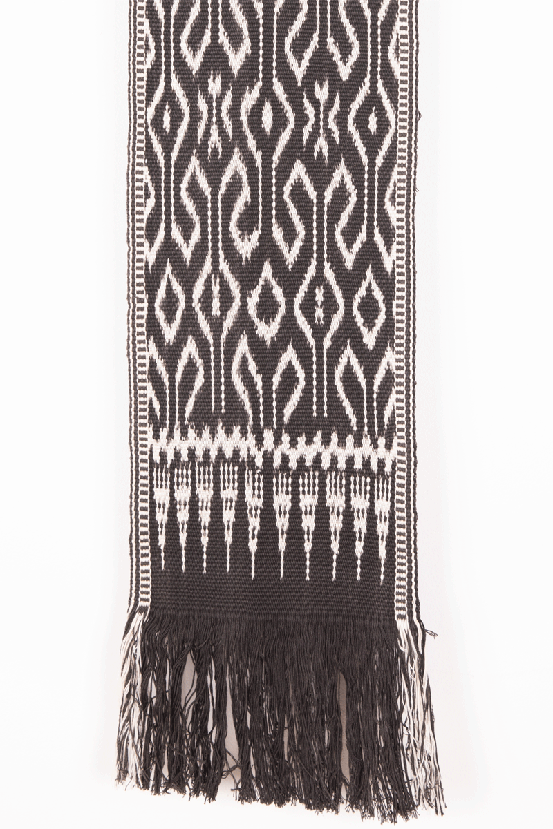 Warp ikat, single panel, open fringe, commercial cotton, natural dyes. Ikat tied, dyed and woven in Mamuju, Sulawesi, 2025. Size 196 x 20 cm / 77 x 8 in