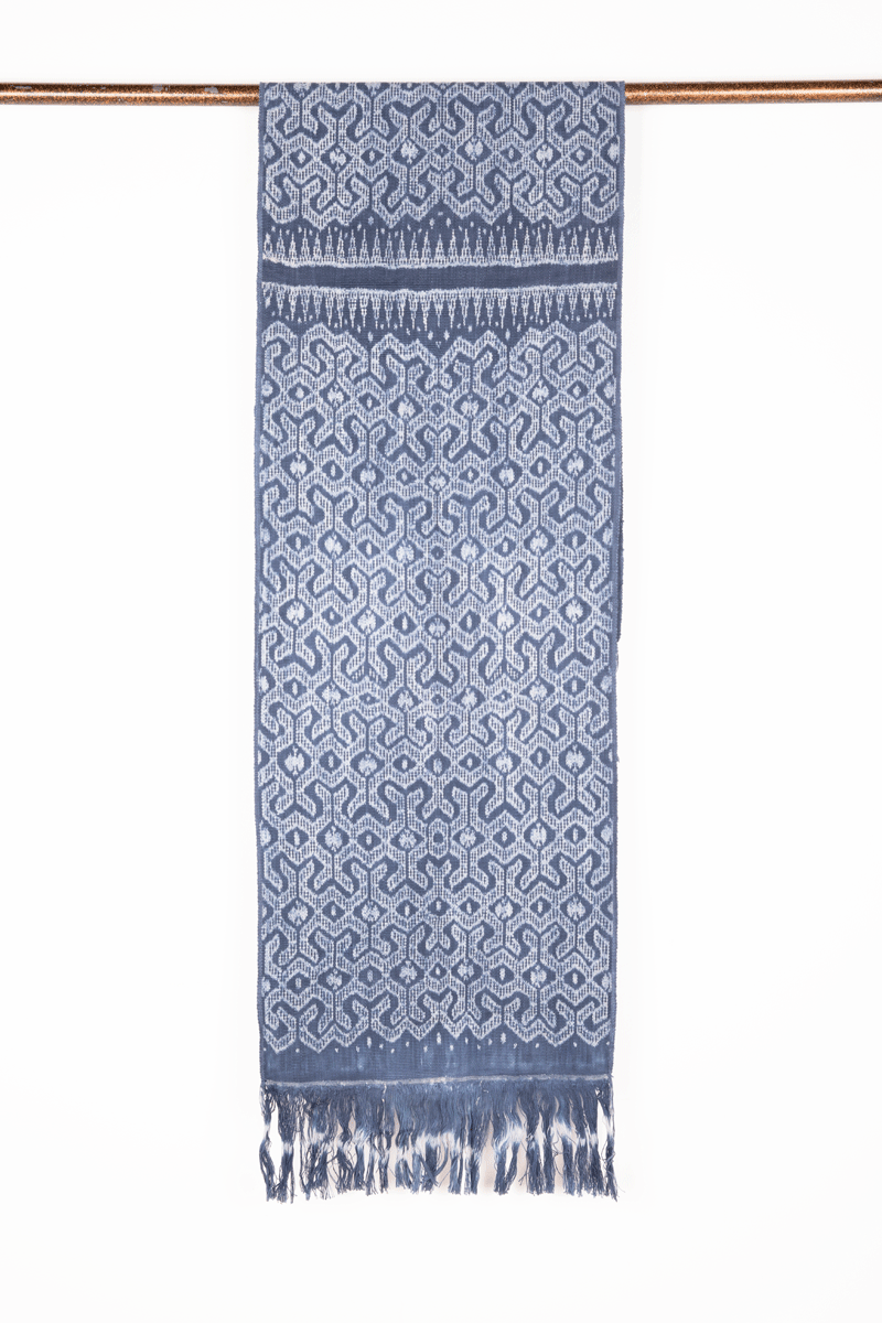 The ikat motif on this textile is called paos kenat refers to the ornate leather belt worn by the lineage of men descended from meo warriors.