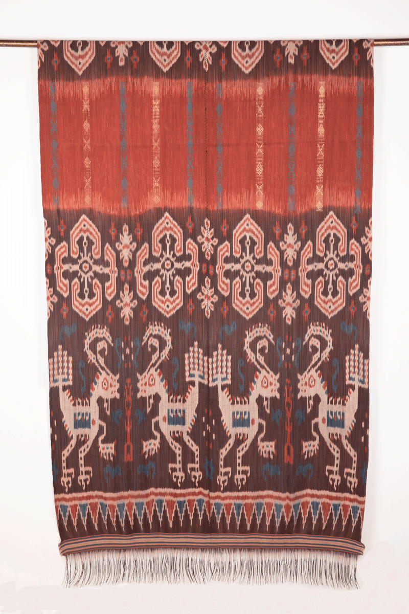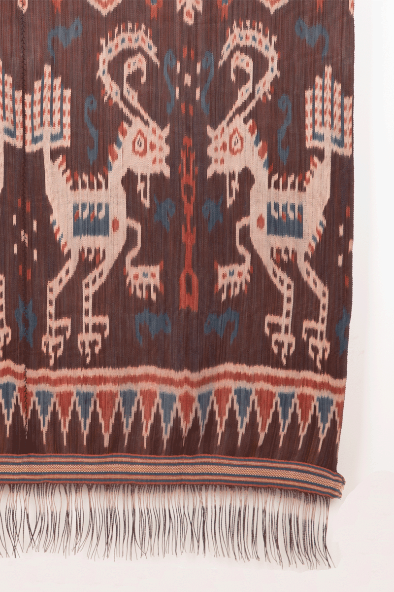 This exquisite ikat textile is called hinggi are designed as two parts that are joined in the center with an almost invisible seam. They are worn in identical pairs during a man's lifetime, folded over the shoulder and wrapped about the hips. Individual design elements perform practical functions, the qualities associated with each motif augmenting the wearer's personal power during life and aiding his journey to the next world after death. Motifs are usually arranged in three to five bands of varying width. The design traditionally announced a man's social status. The motif manu mara is a peacock and symbolizes grace and beauty. This motif relates to nobility.