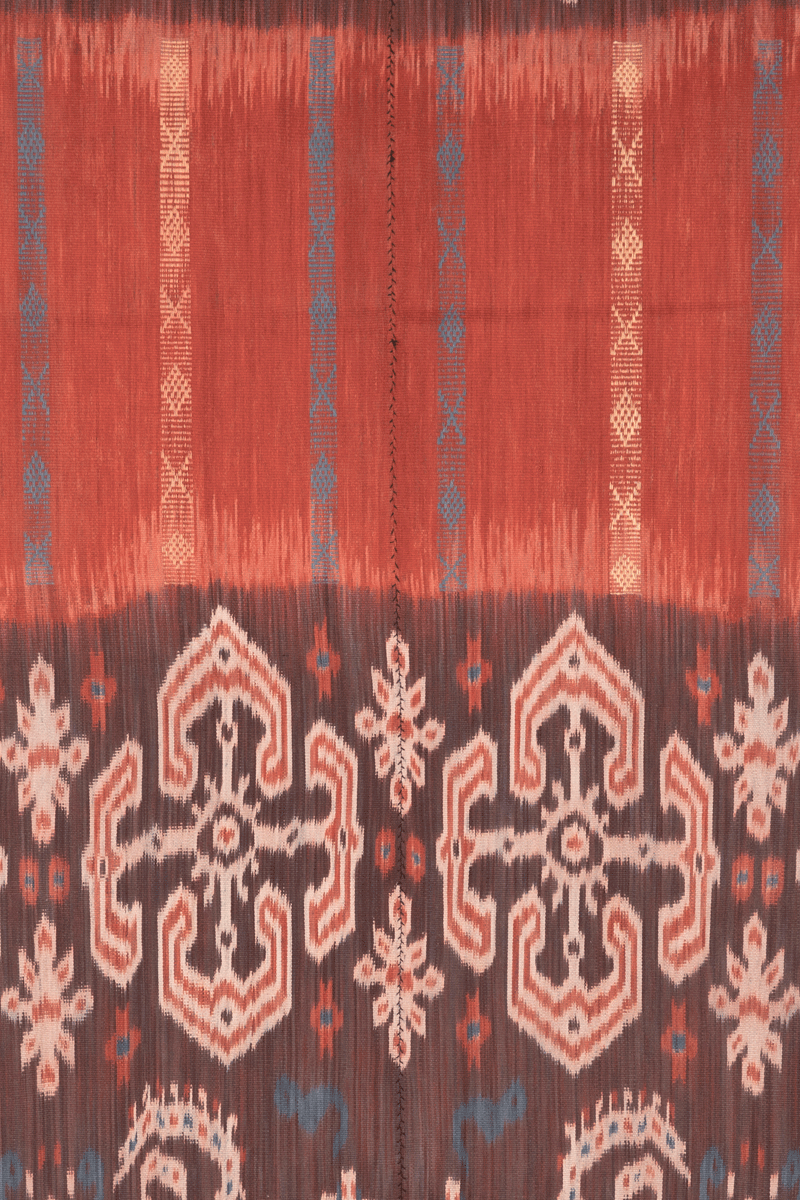 Warp ikat, two panels sewn together, commercial cotton, natural dyes, kabakil striped edging and twisted fringe. Ikat tied, dyed and woven in Sumba, 2021. Size 308 x 115 cm / 121.5 x 45.5 in