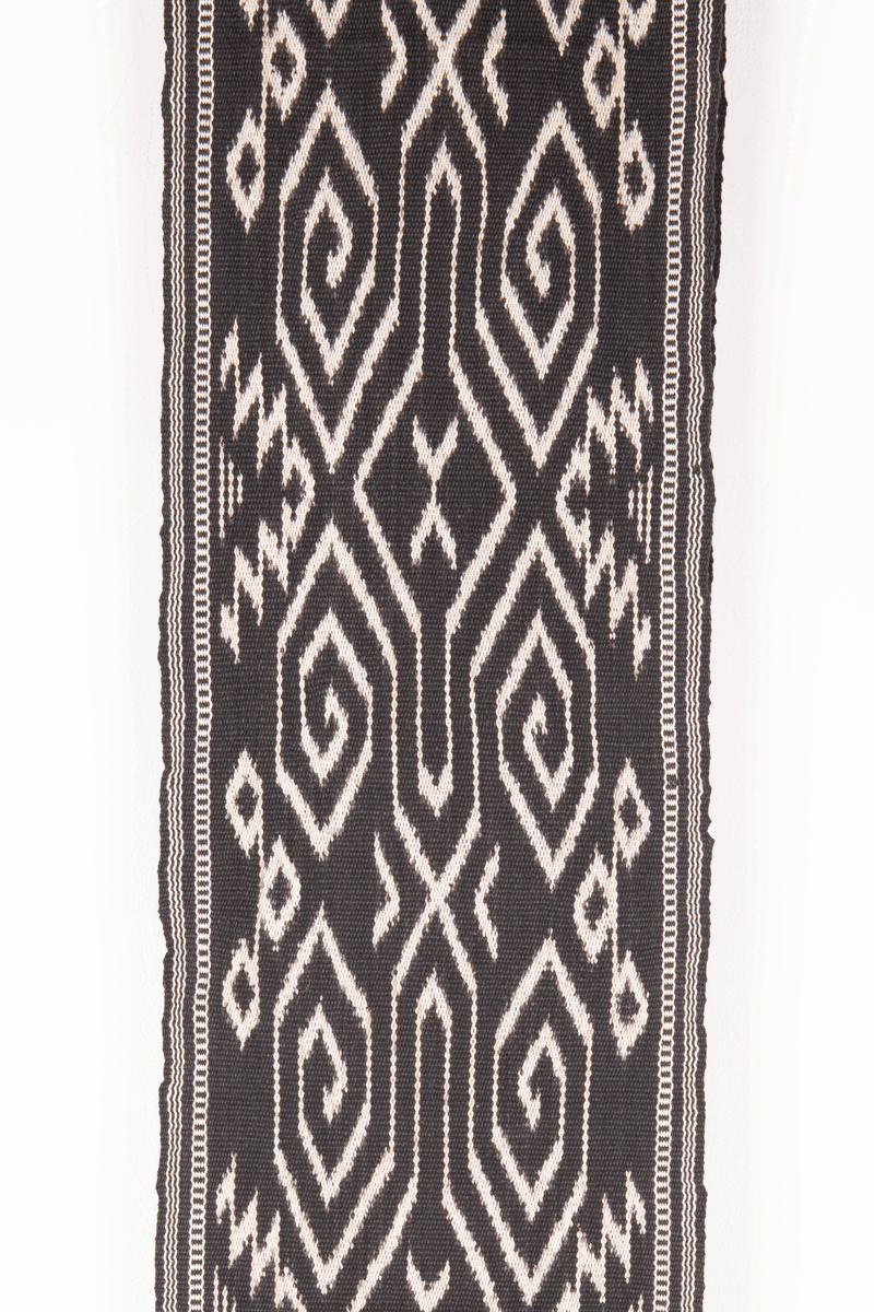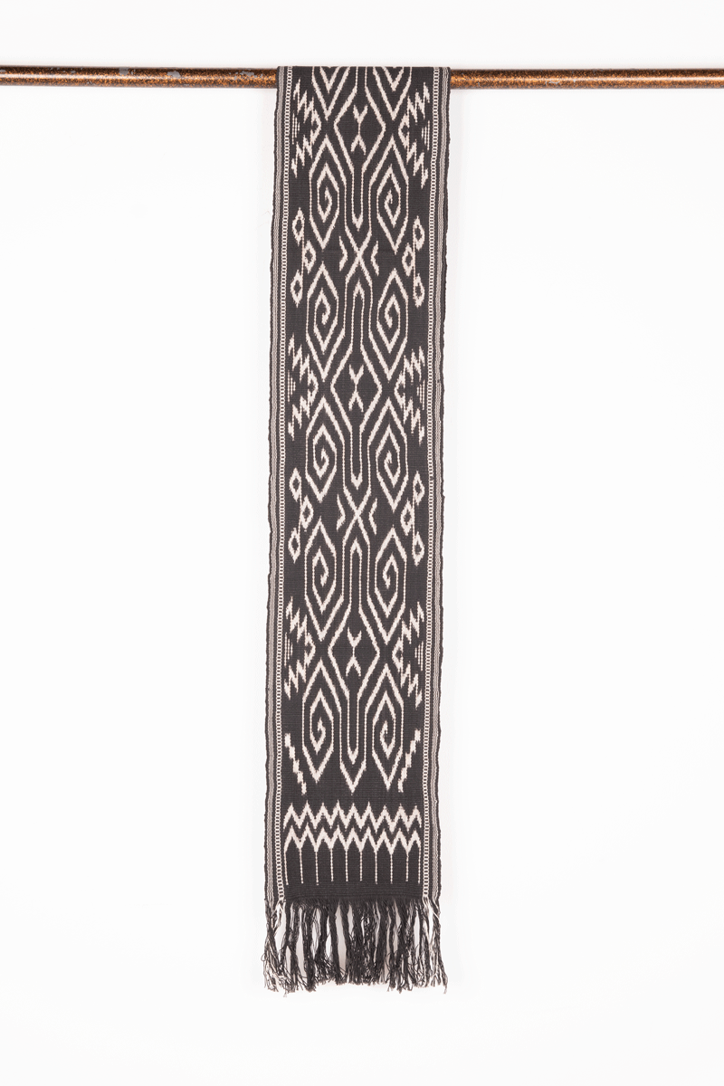 Warp ikat, single panel, open fringe, commercial cotton, natural dyes. Ikat tied, dyed and woven in Mamuju, Sulawesi, 2025. Size 176 x 21 cm / 69.5 x 8.5 in