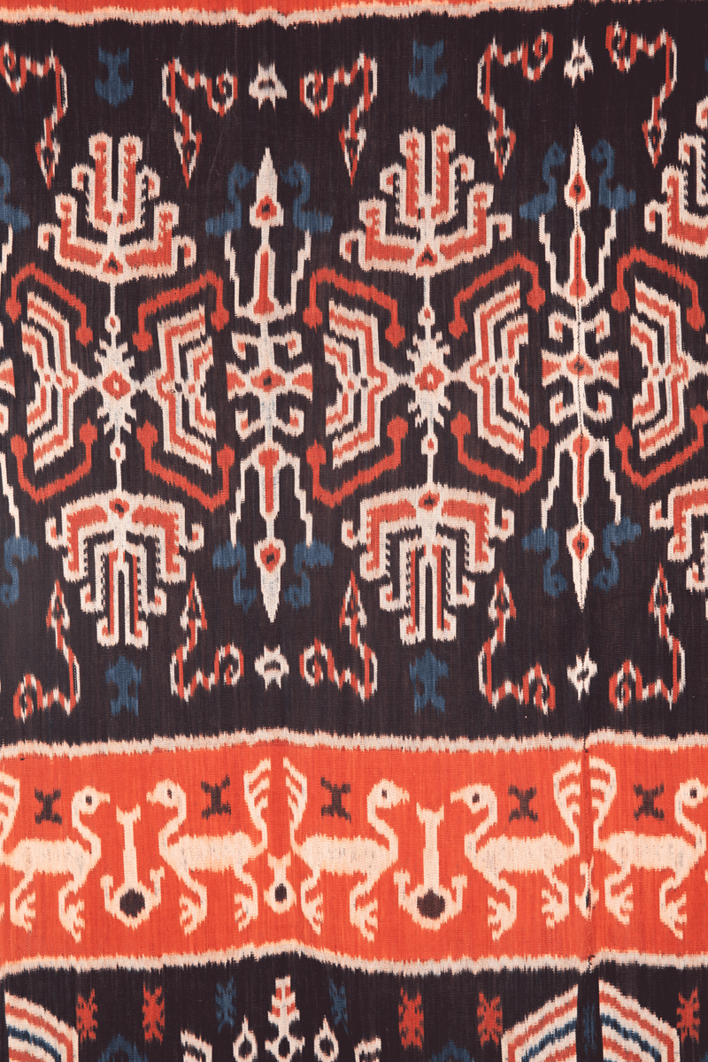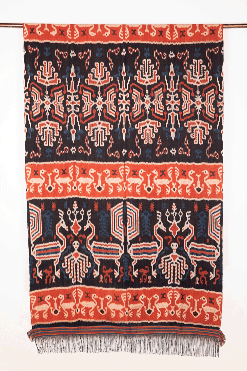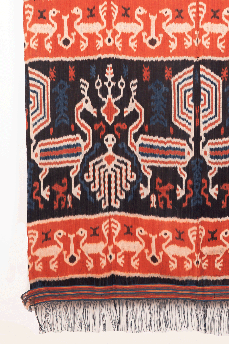 This exquisite ikat textile is called hinggi are designed as two parts that are joined in the center with an almost invisible seam. They are worn in identical pairs during a man's lifetime, folded over the shoulder and wrapped about the hips. Individual design elements perform practical functions, the qualities associated with each motif augmenting the wearer's personal power during life and aiding his journey to the next world after death. Motifs are usually arranged in three to five bands of varying width. The design traditionally announced a man's social status.