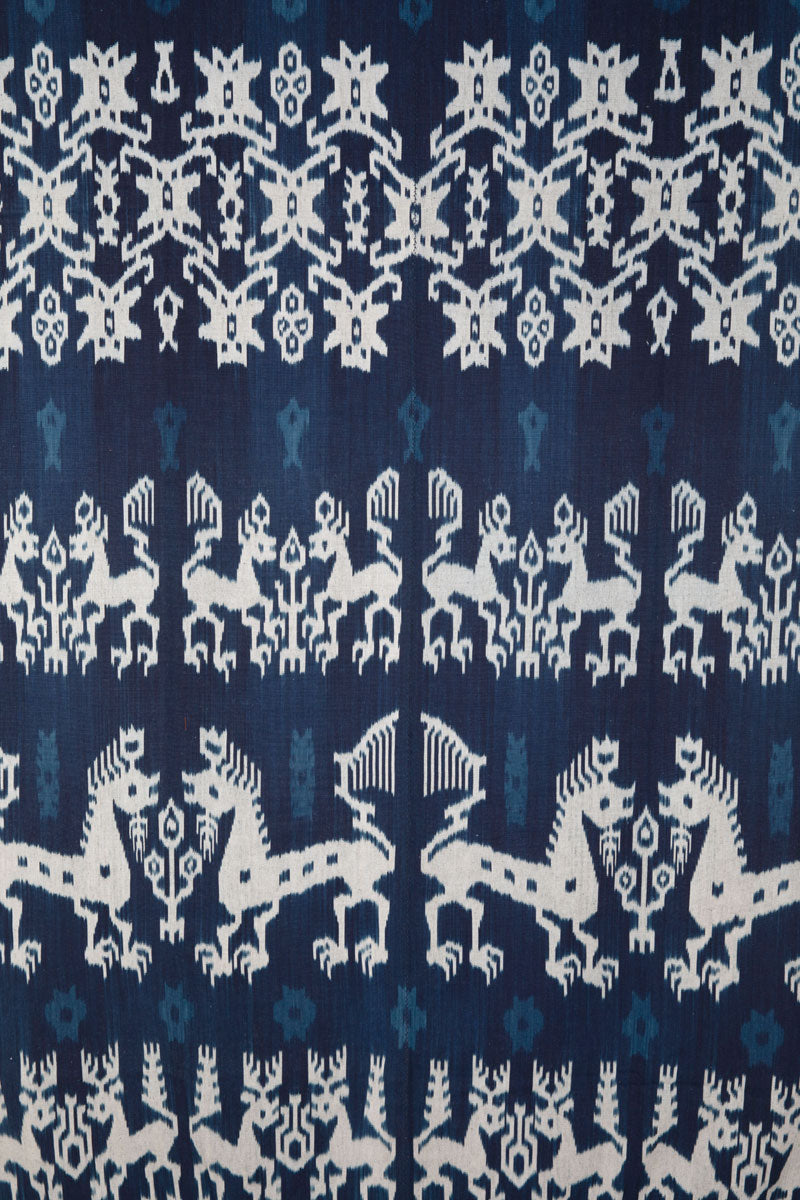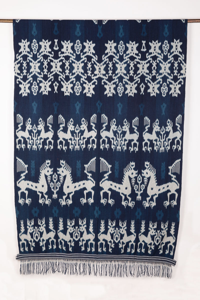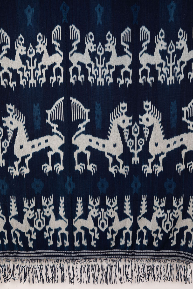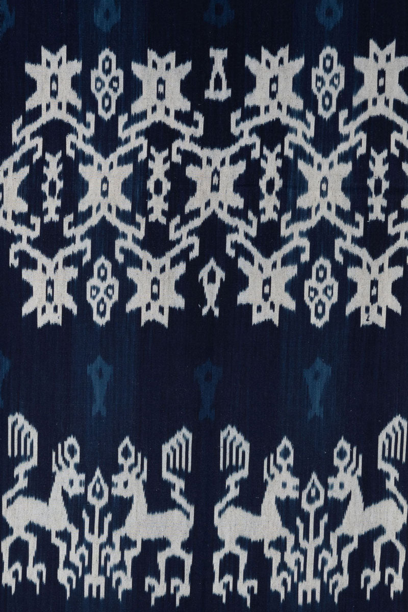 The exquisite sharpness of the white motifs on this deep blue indigo blanket is a mark of a master weaver who takes great pride in her work. Her careful and tedious tying the threads with binds of palm fiber that will resist the repeated application of indigo dyeing is remarkable. The indigo is well finished with no lingering smell of the process which makes it safe to put on your couch or use as a bed throw. The brilliant white ikat patterning denotes a lion motif and borders the main centerfield containing a star kandunu motif.