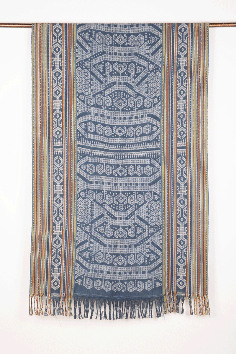 Warp ikat, three panels stitched together, open fringe, commercial cotton, natural dyes. Ikat tied, dyed, and woven in, Timor, 2024. Size 190 x 100 cm / 75 x 39.5 in