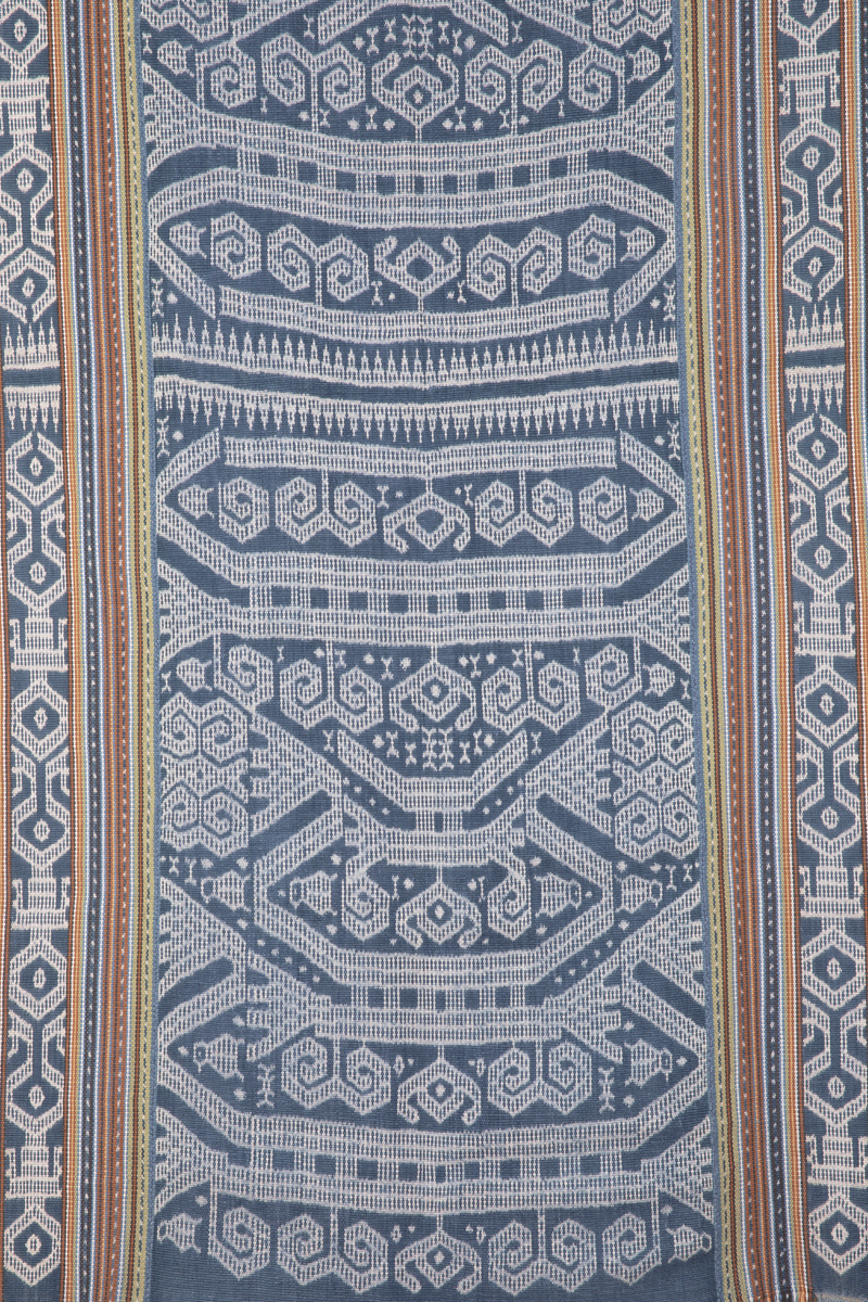 Beti Naek is a three part man’s hip cloth with a center panel made with all ikat patterning and the same motif appearing in the bands on the two side panels. This textile is worn for ceremonies and special occasions. The textiles of Miomafo area in west Timor are renown for their indigo work with intricate ikat.