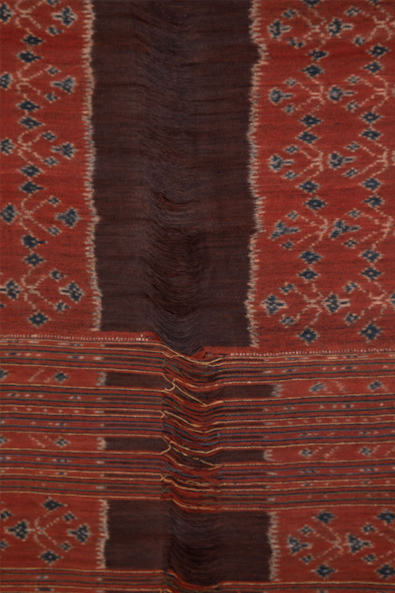 The motif on this textile is called kugupungan which refers to the flower of the tree locally called kugung (Microcos sp). This textile took three years to complete, from spinning the thread to dyeing the threads with their precisely tied patterns repeatedly. The colours in this textile are an extraordinary example of the deep browns, rusts and indigo that make the south Lembata textiles so unique. A textile such as this sell for a high price on the island of Lembata as they are highly sought after for bride wealth gift exchange. Textile offered to the grooms family by the brides clan are exchanged for horses, buffalo, silver or gold.